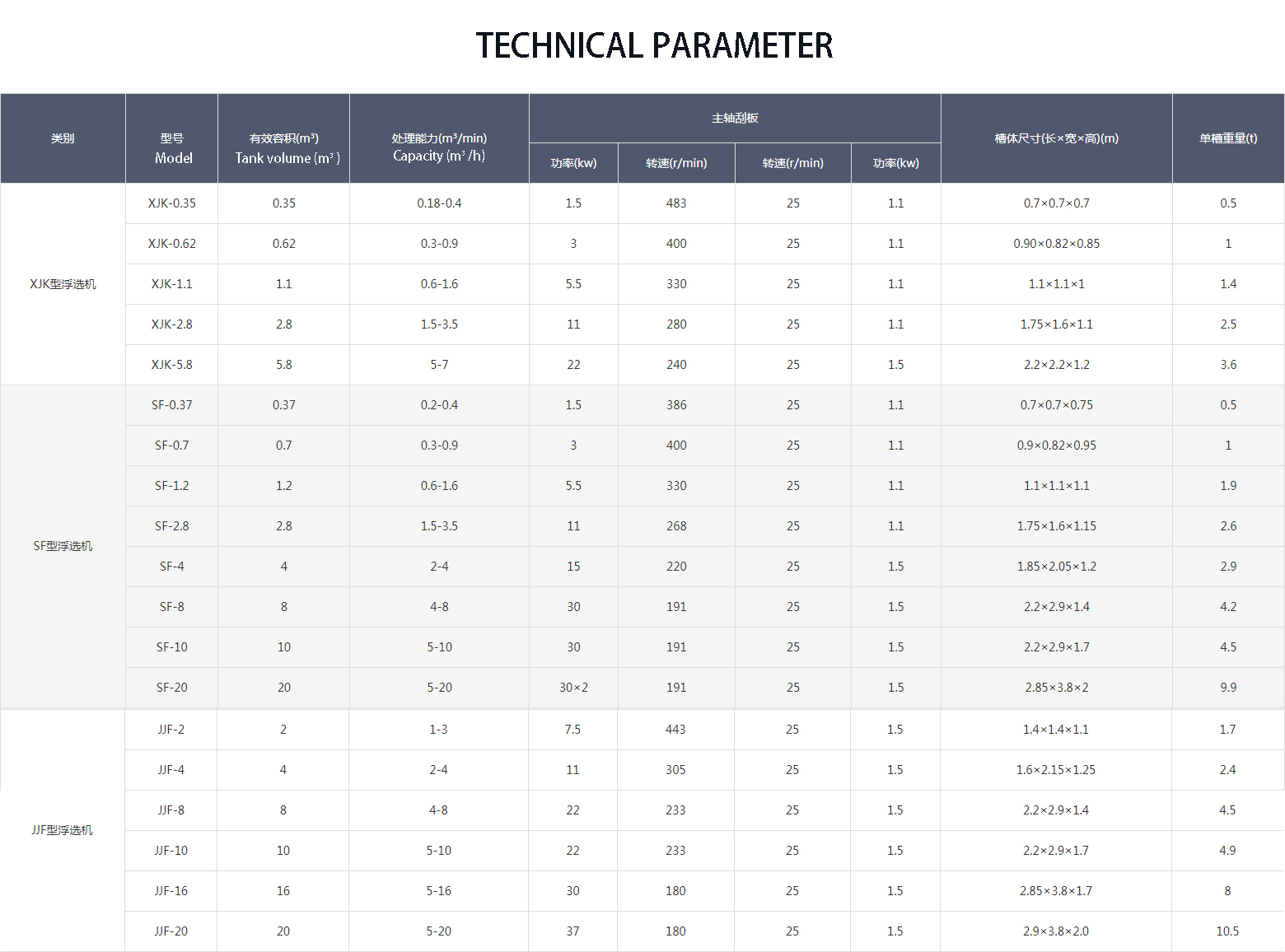 The SF flotation machine is the abbreviated term for the froth flotation machine, which is a type of mechanical equipment used to complete the flotation process. Flotation is a mineral processing method widely applied in mineral production. Through agitation and aeration, certain mineral particles selectively attach to air bubbles, rise to the surface of the pulp, and are scraped off to form a froth product. The remaining portion stays in the pulp, achieving the purpose of mineral separation. The flotation machine is primarily suitable for separating metallic minerals such as gold, silver, copper, iron, lead, zinc, molybdenum, nickel, and aluminum. It can also be used for the roughing and cleaning of non-ferrous metals and non-metallic minerals. It is an indispensable and crucial piece of equipment in the mineral processing production line.